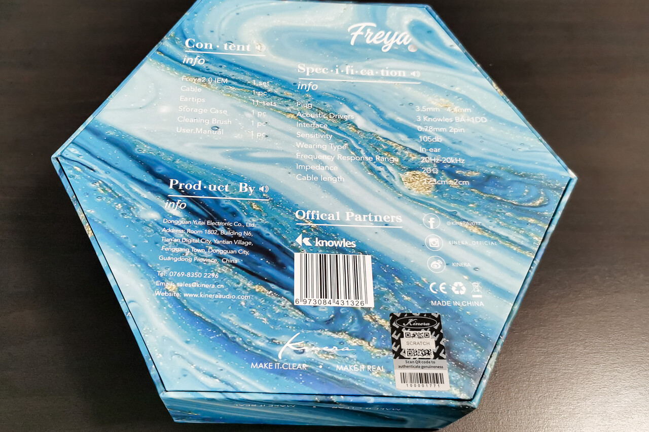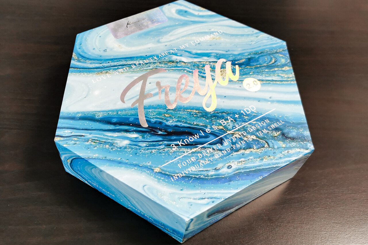 「Kinera Freya 2.0」のパッケージはミドルグレード以上および「Kinera Imperial」ブランドでお馴染みのヘキサゴン形状の大きめのボックス。本体カラーのイメージに合わせてライトブルーの流線のイメージが描かれています。パッケージの高級感においては同ブランドは抜きん出た印象がありますね。