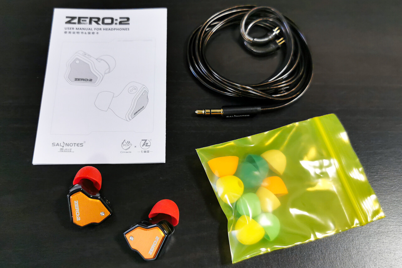 パッケージ内容はイヤホン本体、ケーブル、イヤーピース、ケーブル、説明書。イヤーピースも「ZERO」同様にカラフルなシリコン製で2種類、それぞれ3サイズ。