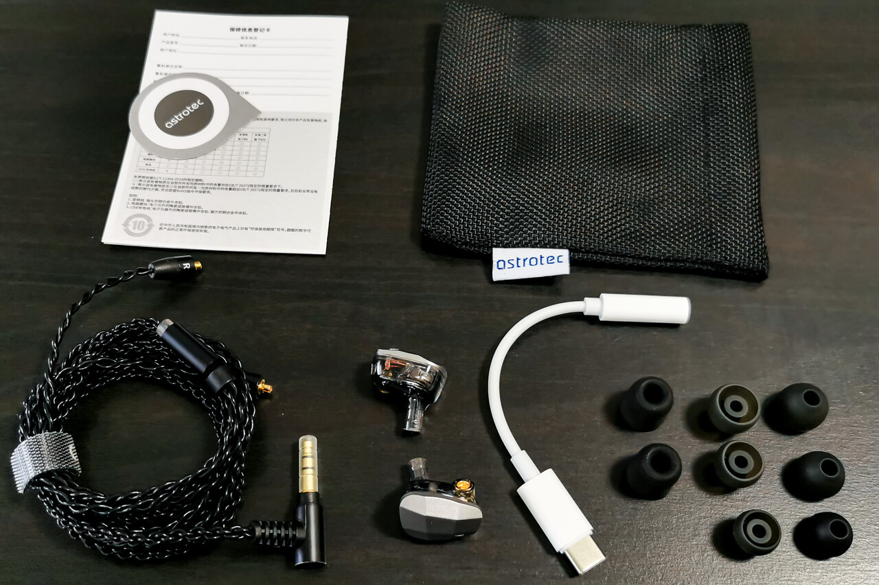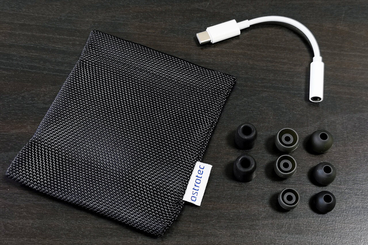 パッケージ内容は、イヤホン本体、ケーブル、イヤーピース(シリコンタイプがS/M/Lサイズ、ウレタンタイプが1ペア)、USB Type-C変換ケーブル、布製ポーチ、説明書など。