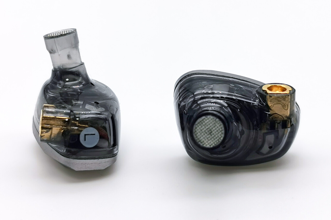 本体は樹脂製のハウジングにアルミニウム合金性のフェイスプレートを組み合わせたデザイン。ダイヤモンドカットされたデザインが特徴的です。従来のGXシリーズのサイズ感を踏襲していますが、印象として最近のイヤホンの中でも特にコンパクトにまとまっています。相対的にステムノズルが大きく見えますが実際はKZやTFZなどのノズルと同程度の太さで、いかに本体が小さいかが伺えます。