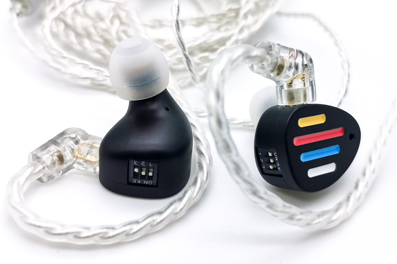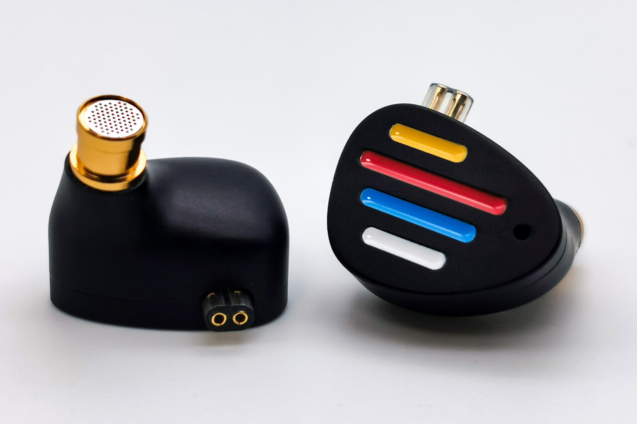 本体はCNC加工で切削されたアルミ合金製。5BA+1DD構成としては比較的コンパクトにまとめられており、軽量なサイズ感です。カラフルなフェイスデザインはシンプルなデザインですが非常にモダンで個性的ですね。ステムノズルは太めですが耳への収まりは良い印象です。