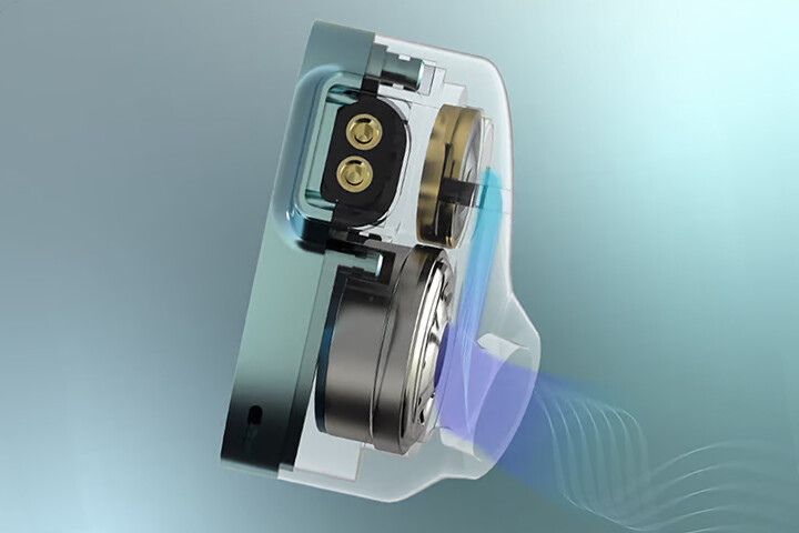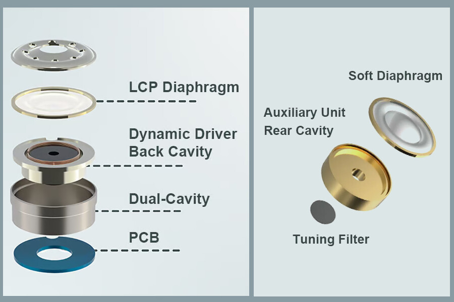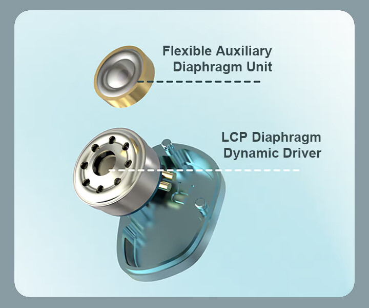 また搭載される10mmLCP振動板ダイナミックドライバーは、デュアルキャビティ構造により空気圧を正確に制御し振動板をスムーズに動作させ、バックキャビティ内の空間が増加し音場を広くすることでディテール豊かなサウンドを実現します。さらに6.8mmフレキシブルパッシブラジエーターを組み合わせることで、高音域の刺さりを軽減し、優れた明瞭性と明るさを備えた豊かな中高音域のディテールを楽しむことができます。