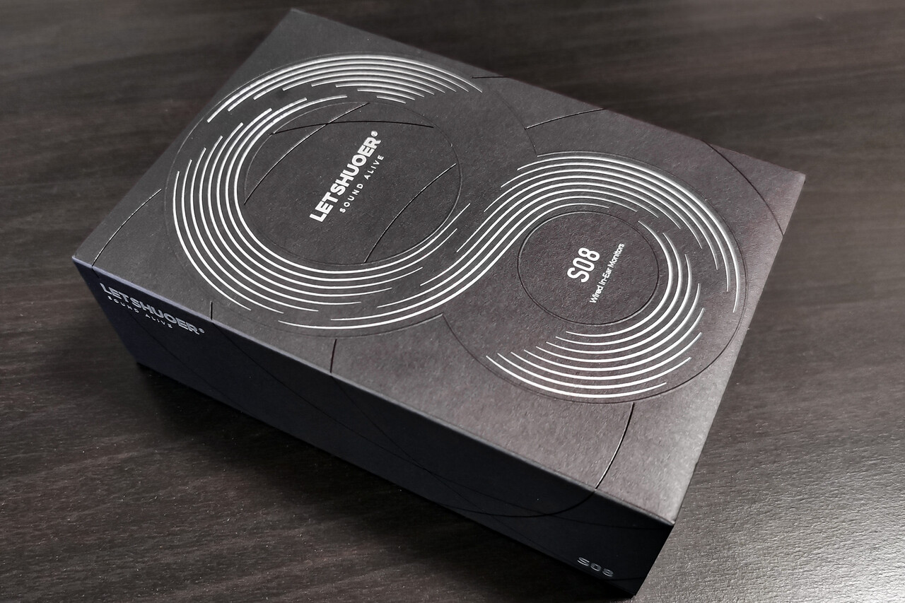 というわけで「LETSHUOER S08」のパッケージですが、「8」のモチーフをデザインされた黒箱タイプ。本体のデザインも「8」なので何故かな、と思ったら「LETSHUOER」の8周年モデルなんですね。納得です。