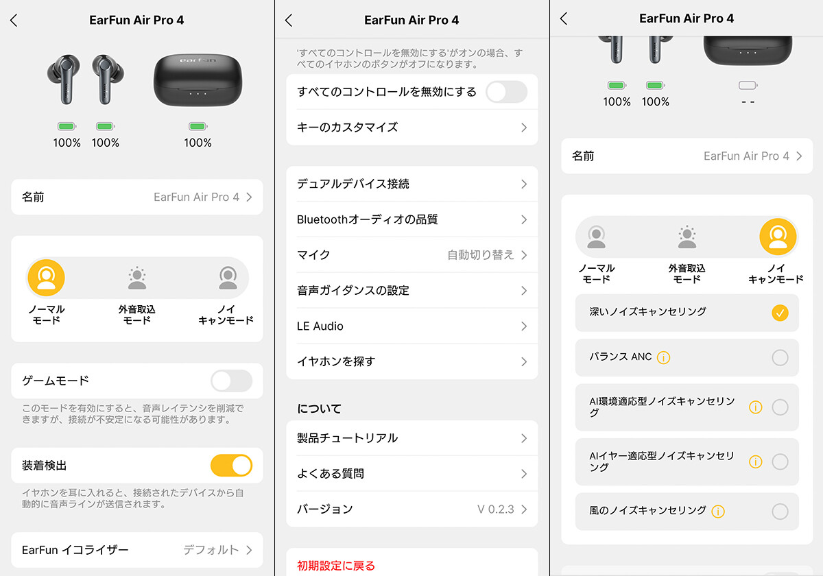 ちなみに初回ペアリング時はイヤホン本体を充電ケースから取り出して接続したのですが、通常はケースのフタを開けるだけで電源がONとなり、デバイスと接続します。この場合は充電ケース側のバッテリー状態もアプリで確認できます。アプリの画面ではANCモードの変更、ゲームモードのON/OFF、装着検出のON/OFF、イコライザー機能などが表示され、ANCをONにするとアプリ上ではさらにANC強度やモードを調整することが出来ます。またメニュー画面で下方向にスクロールするとそれ以外のメニューがあり、デュアルデバイス接続のON/OFFやLE Audio機能、音声ガイダンスの言語、コントールのカスタマイズなどが設定できます。