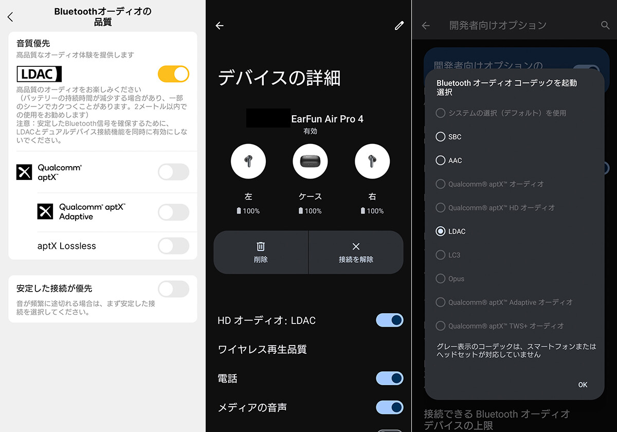 「EarFun Air Pro 4」は対応するAndroidスマートフォンやDAP等では「aptX Adaptive(またはLossless)」コーデックでペアリングします。「aptX」系(Snapdragon Sound)と「LDAC」はアプリによる切替式で、再起動して再接続となります。そのため初期状態では「LDAC」は無効となっています。なお、「aptX」<「aptX Adaptive」<「AptX Lossless」という性能差になっており、「aptX Adaptive」は「aptX Adaptive」対応または「Snapdragon Sound」対応のスマートフォン等で、「AptX Lossless」は「Snapdragon Sound with aptX Lossless」対応のスマートフォンで利用できます。