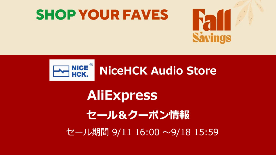 こんにちは。今回は現在AliExpressで開催中の 「AliExpress 9.11 Fall Savings Sale」(日本時間 9月18日15:59まで)にて、お馴染み「NiceHCK Audio Store」のセール対象のクーポン情報をまとめて紹介します。