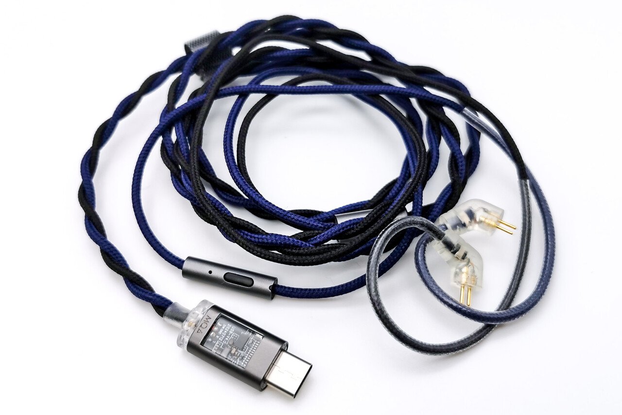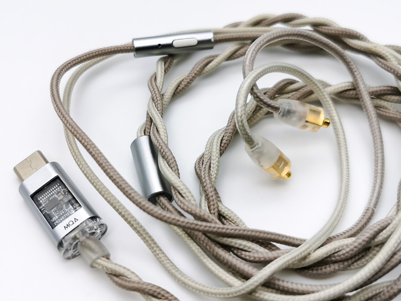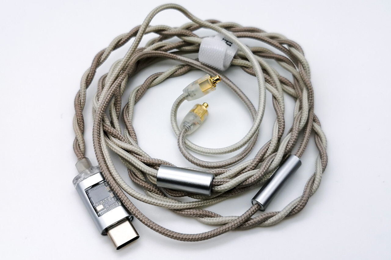 そして、ある意味イヤホン本体より「こっちがメイン」といった趣のDSPケーブルですが、こちらは布張りの被膜で明らかに高級感のある仕上がりになっています。線材は高純度OFC(無酸素銅)線で左右2芯の寄り線仕様となっています。DACチップ等を内蔵したDSP USB-Cインターフェースはクリアパーツで内蔵する基板を見せる仕様になっており、この部分へのこだわりが強調されています。ケーブルは取り回しも良く使いやすい印象です。