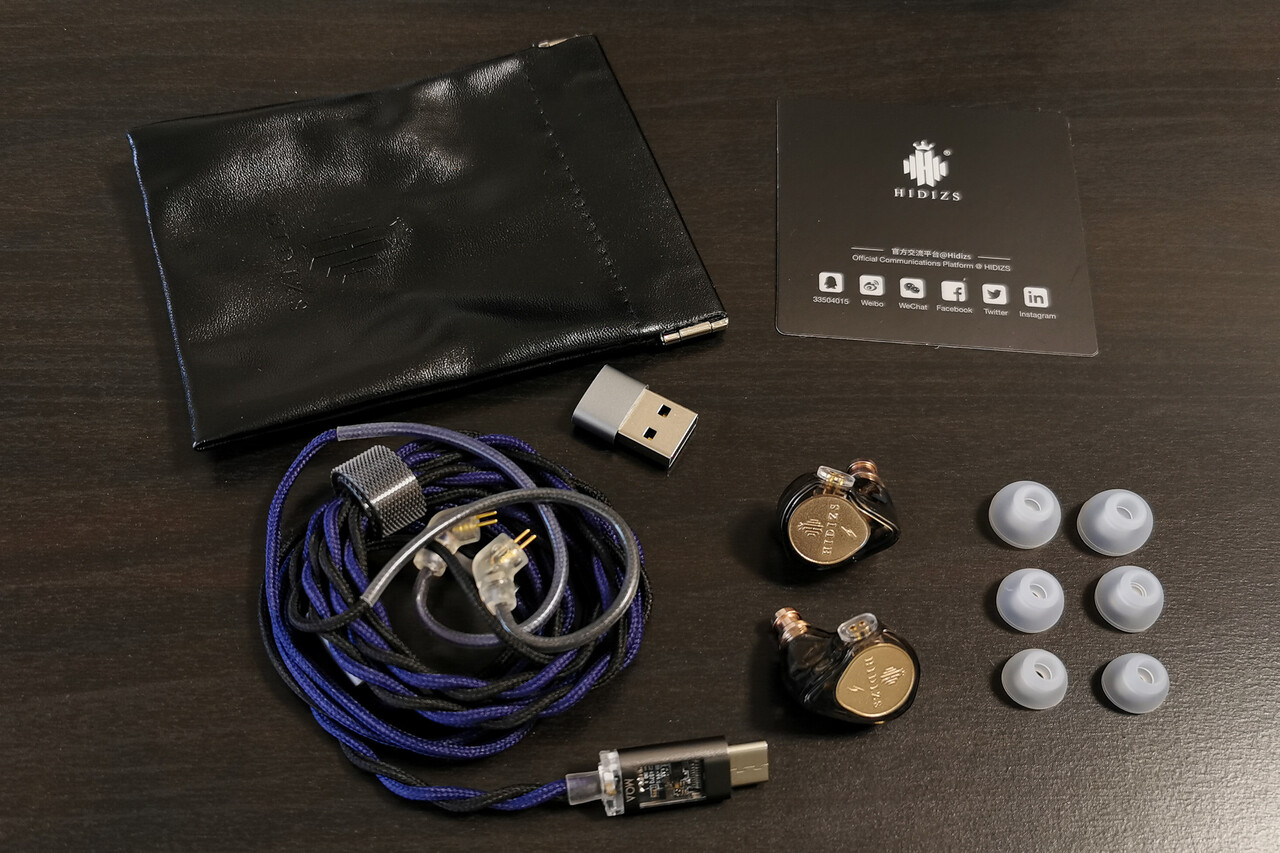 パッケージ内容は、イヤホン本体、USB-C DSPケーブル、USB Type-A変換コネクタ、イヤーピース(S/M/Lサイズ)、レザーポーチ、保証カードなど。必要なアイテムはパッケージに過不足無く含まれています。
