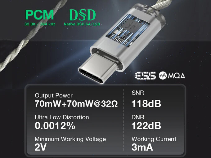 「HIDIZS ST2 PRO Nebula」は0.78mm 2pin仕様のリケーブル可能なイヤホン製品で、ケーブルプラグ部分にはUSB-Cのデジタルインターフェースを採用。ESS製の最新DACチップ「ES9218AC PRO」を搭載し、32bit/384KHz PCM、DSD 64/128 のハイレゾ再生、およびMQAに対応。さらにDNR 122dB、THD 0.0012%の低ノイズ特性と、最大70mW@32Ωの高出力により、高性能オーディオアダプタやデジタルプレーヤーに匹敵する優れたオーディオ品質を実現します。