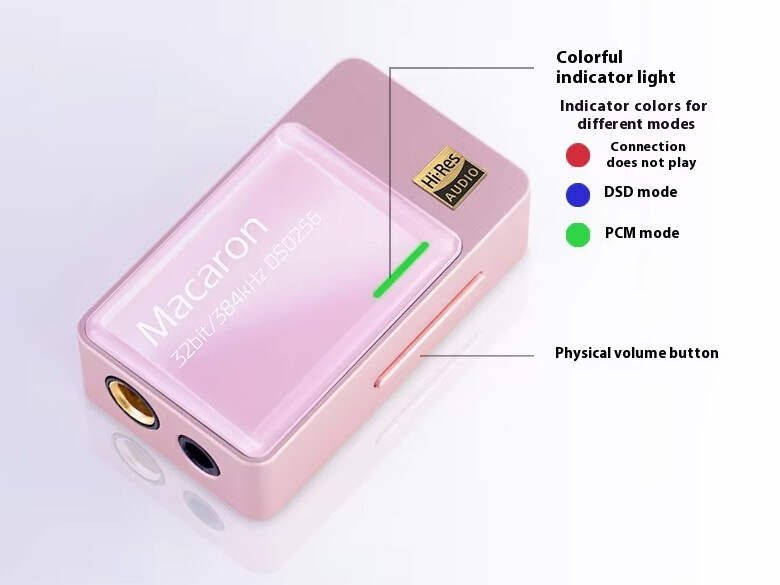「iBasso Jr. Macaron」は高音質を実現しつつ80mAの低消費電力を実現し、スマーフォンなどに接続時のバッテリー消耗も不安を最小にします。本体にはインジケーターがあり、再生フォーマットによりカラーが変更します。また側面には独立設計のボリュームボタンがあり100段階での音量調整が可能。