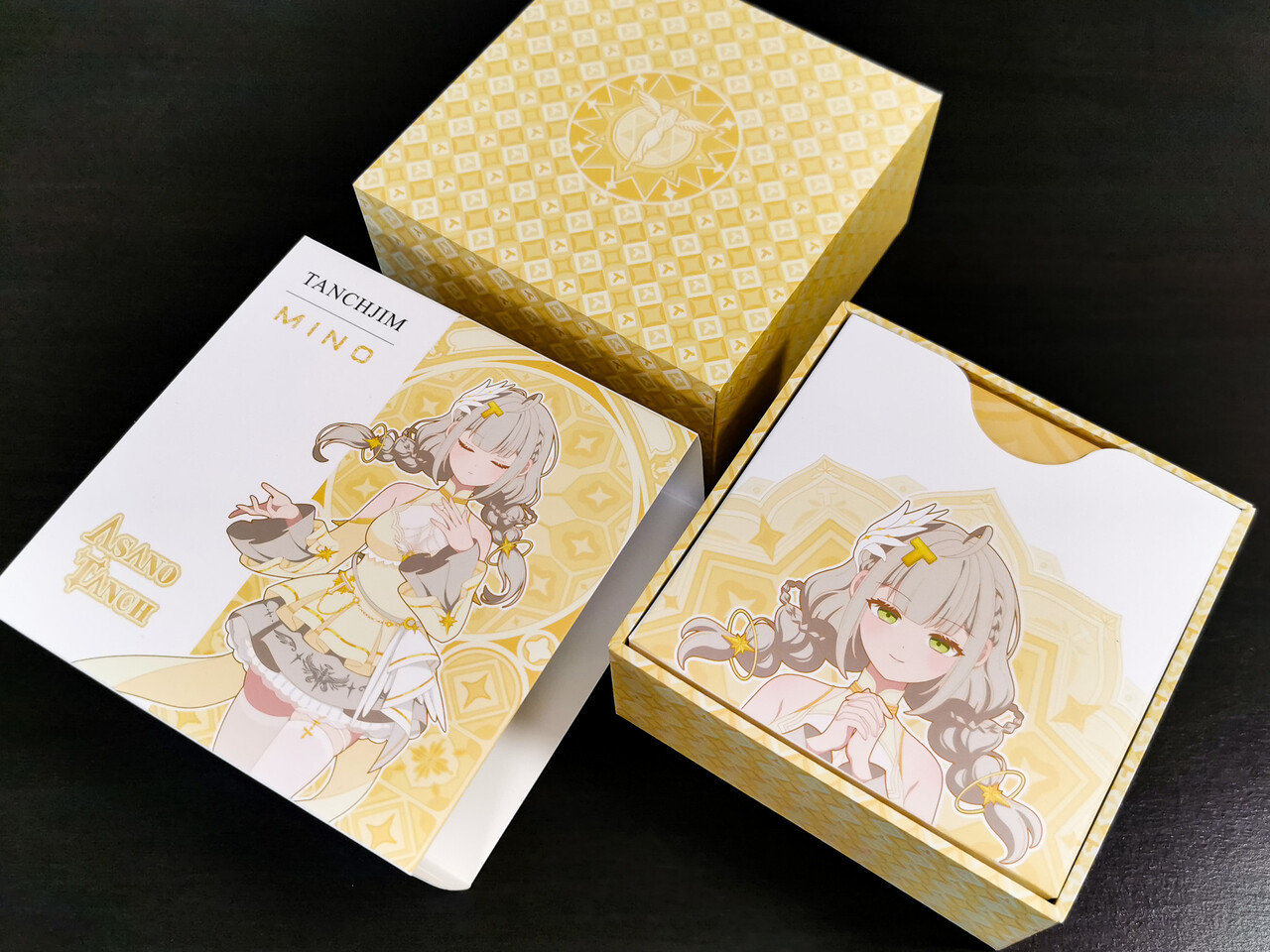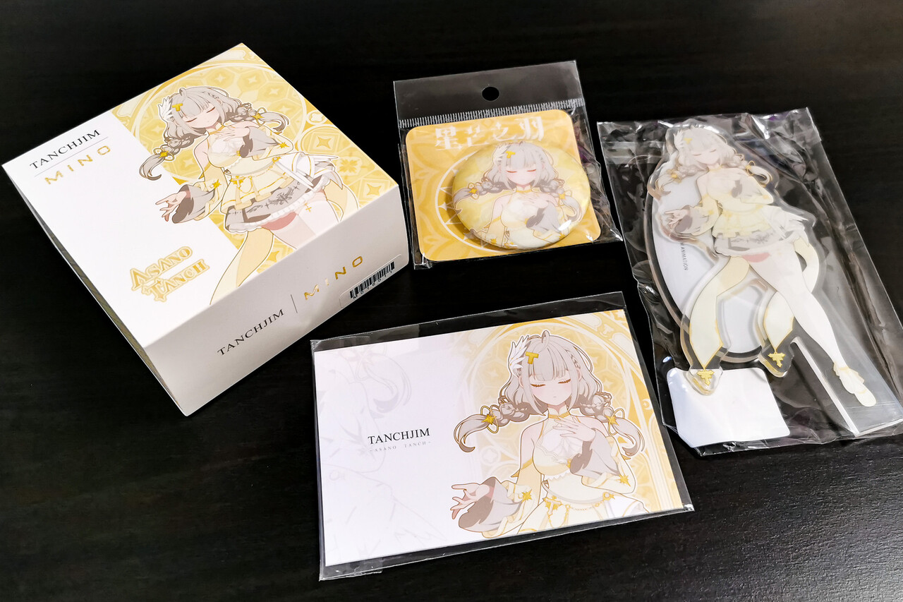 「TANCHJIM MINO Asano Tanch」のパッケージは限定バージョンならではのデザインですが、パッケージ以外に付属品がいろいろ一緒に届いたのは驚きです。今回はポストカード、アクリルスタンド、缶バッジが付属してました。