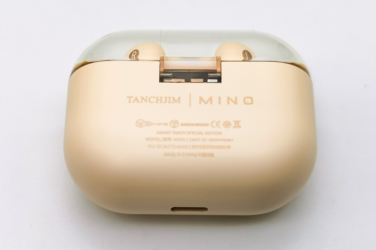 本体デザインはオリジナルの「MINO」を踏襲しており、充電ケースは透明パーツのフタにAirPods Pro型の形状のイヤホン本体。「TANCHJIM MINO Asano Tanch」ではライトイエローのカラーリングで、充電ケースには「浅野てんき(Asano Tanch)」キャラクターイラストがプリントされています。なおケース裏面には技適マークもプリントされており、日本国内利用も問題ないようです。
