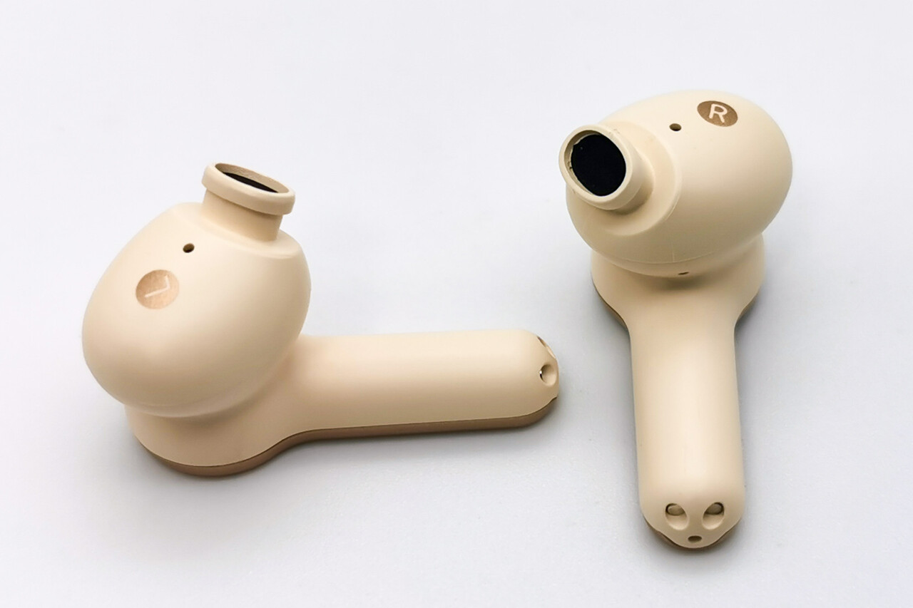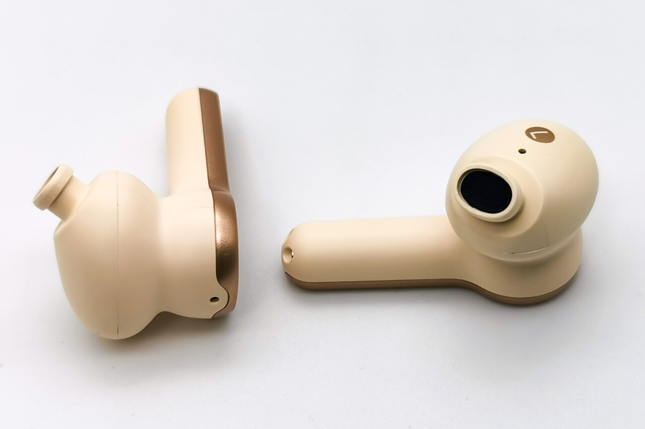 本体もケースと同様のライトイエローで本体のタッチセンサー部分はゴールドでカラーリングされています。10mmサイズとTWS製品としては比較的大口径のドライバーを搭載しつつ耳に収まりやすいサイズ感で装着感は良好です。
