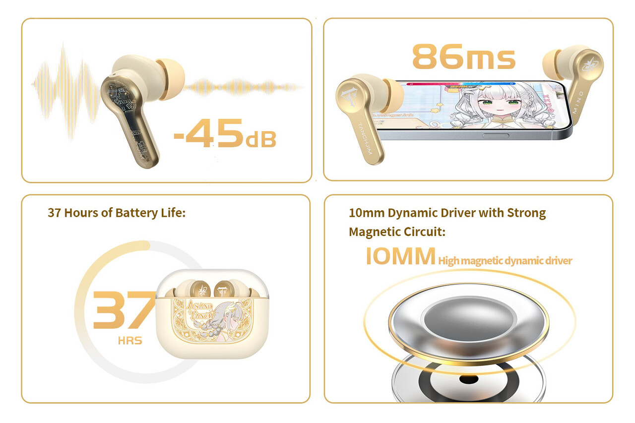ドライバーには強力な磁気回路を備えた 10mm ダイナミック ドライバーを搭載し、超低歪みでクリアでクリーンなサウンドを実現。また「TANCHJIM MINO Asano Tanch」には、最大-45dB のANC(アクティブノイズキャンセリング)機能を搭載しています。