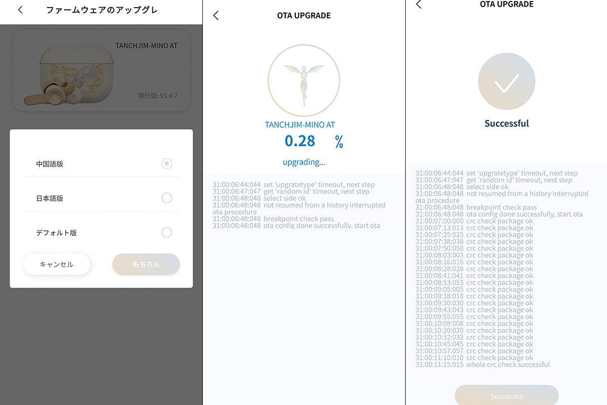 出荷時状態では「TANCHJIM MINO Asano Tanch」は中国語版のファームウェアがインストールされているため、音声アナウンスは中国語となります。そのためまず「TANCHJIM」アプリの「ファームウェアOTAアップデート」画面で日本語ファームウェアをインストールします。またファームウェア自体のアップデートがある場合は接続すると自動的にこの画面へ促されます。アップデートでは「日本語」ファームウェアを選択し、アップデートを実施。無事成功すると再接続が行われ、以降は日本語でのアナウンスになります。