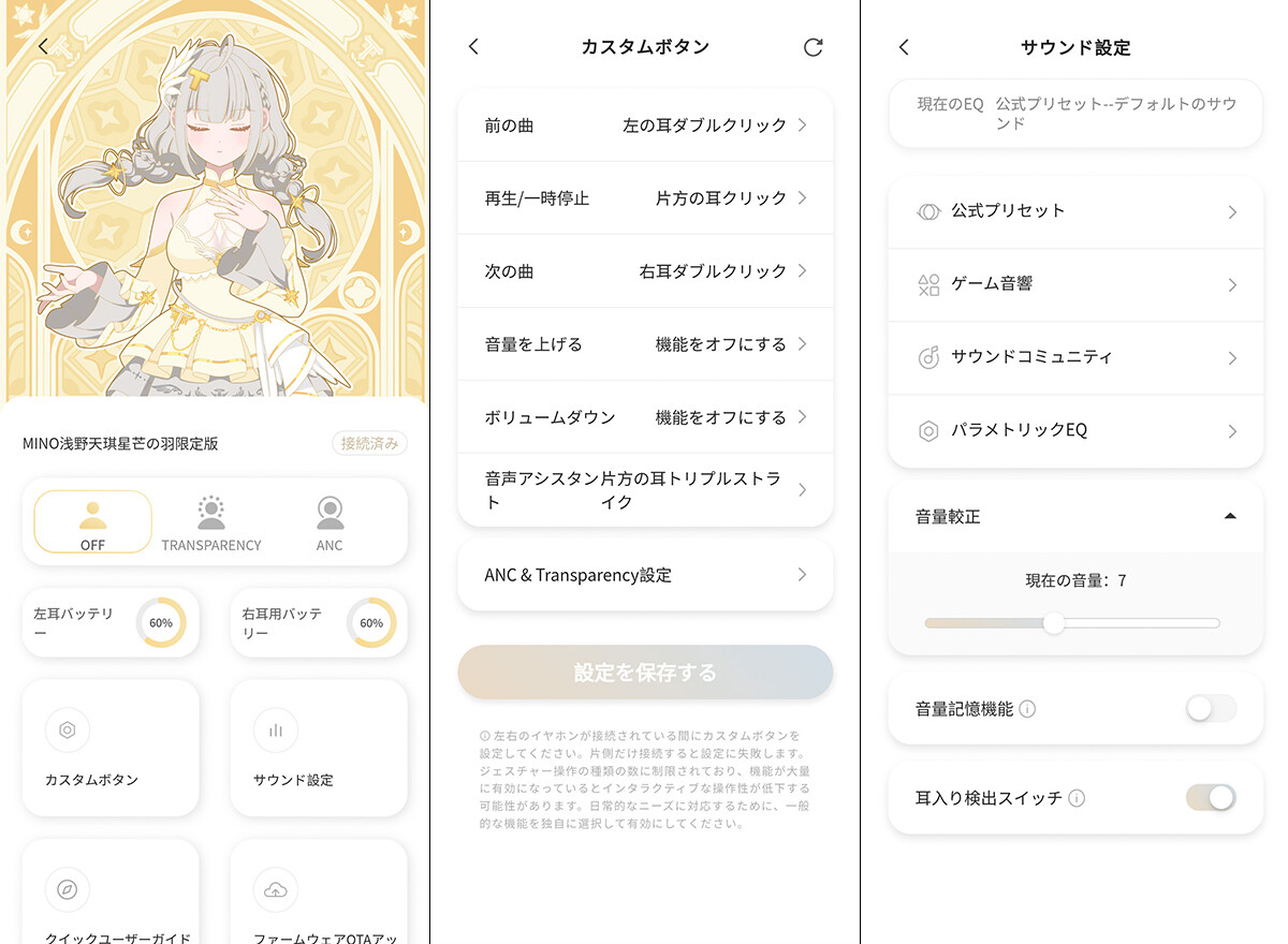 タッチセンサーはシングルタップで再生、ダブルタップで送り/戻し、ANCやゲームモードは長押しで設定されています。「TANCHJIM MINO Asano Tanch」では設定変更時の音声が女性声優さんのキャラボイスになっています。