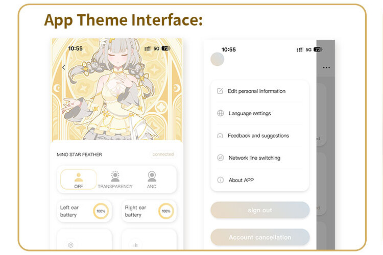 また86msの低遅延ゲームモードの対応、Bluetooth5.3対応で、ケース込みでは最大37時間の長時間再生が可能です。そして専用の「Tanchjim」アプリでも「Feather of Starlight」テーマのインターフェイスを採用しています。