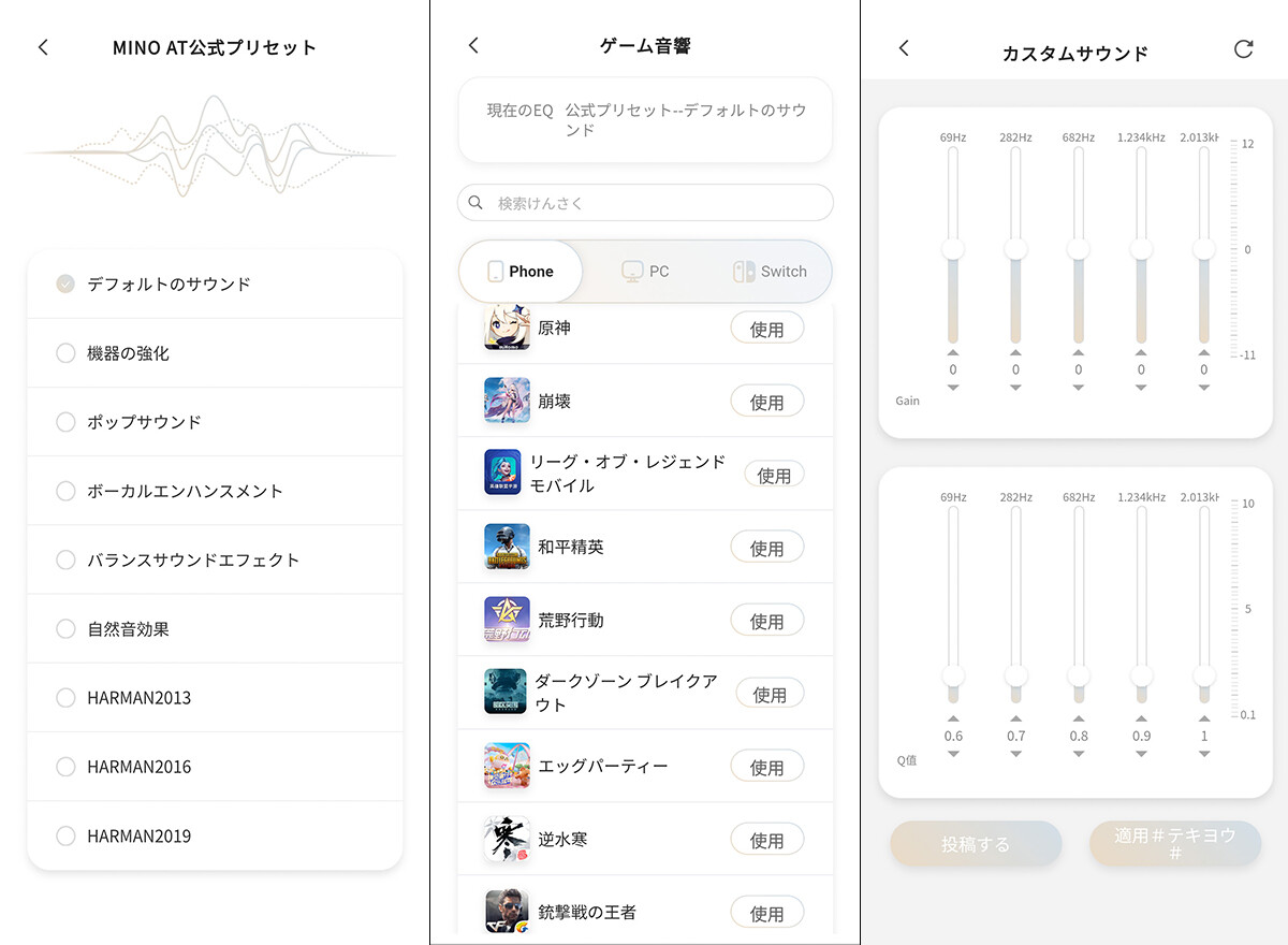「サウンド設定」ではマニュアルのイコライザ設定のほか、プリセットのなかに「ハーマンターゲット」も3種類あるのが特徴的です。またゲームタイトルごとの設定や、ネットで共有されるプリセットが選べるのも興味深いですね。
