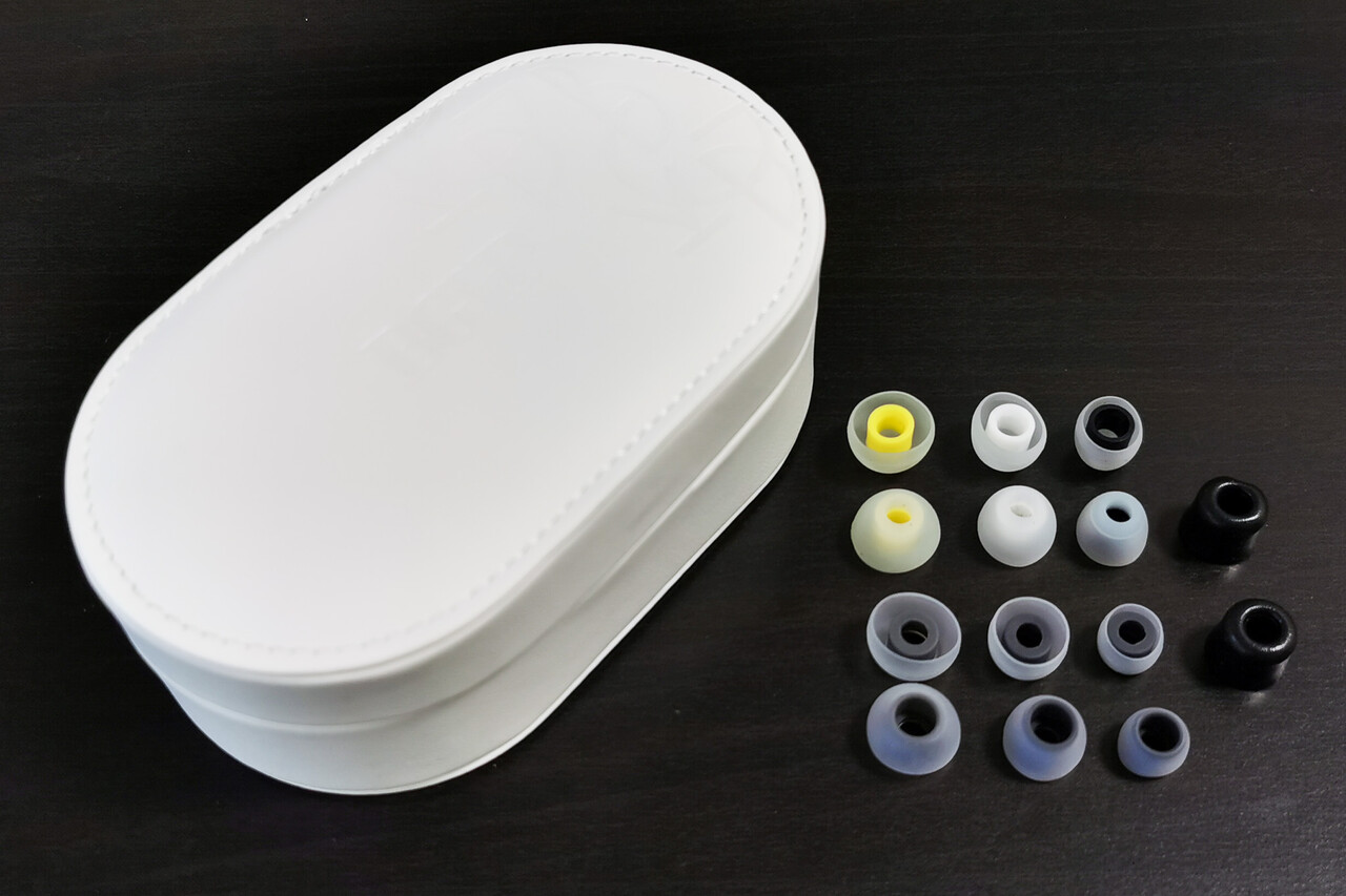 ケースは大きめのハードケースでイヤーピースはシリコン製が2種類、各S/M/Lサイズ、およびウレタン製が1ペア付属します。