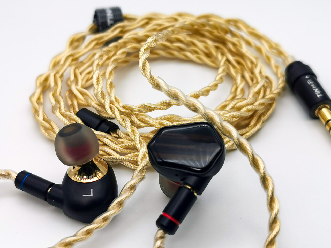 ケーブルは、2種類の高純度銅線をミックスした線材を使用した4芯タイプでライトゴールドのカラーリングが高級感がありますね。コネクタはMMCXを採用しています。コンパクトなシェル形状で耳の形状や位置によって本体部分の装着角度が微妙に変わるため、ShureのSEシリーズやAONICシリーズ同様に接続した上でコネクタをある程度回して調整出来るMMCXコネクタは装着感を向上させる上でメリットがあったりしますね。