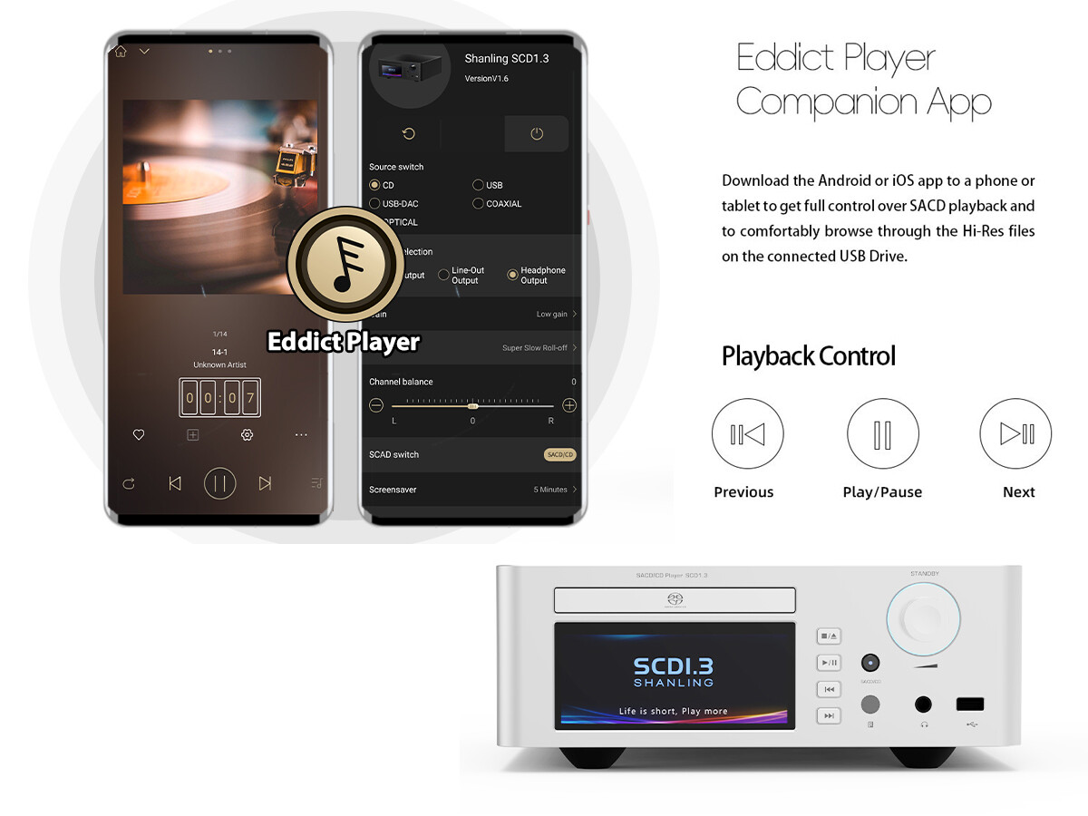 「SHANLING SCD1.3」の操作はフロントパネルのタッチスクリーン操作、リモコン、スマートフォンでの「Eddict Player」によるリモート操作、の3種類の方法があります。内部の制御系には「H7」や「EH3」など同社のポータブル/据置きのUSB-DAC等で採用されている「Ingenic X2000」プラットフォームが搭載され、タッチスクリーンは同社の独自OS仕様のDAPと同じ「MTouch」が採用されています。