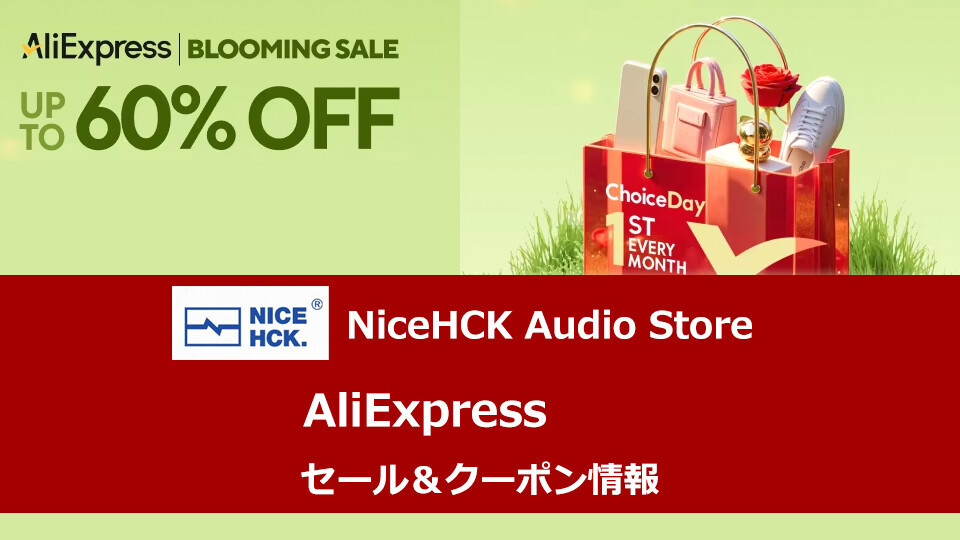 こんにちは。今回はAliExpressで3月1日17時から開催の 「03.01-03.05 BLOOMING SALE」(日本時間 3月1日17:00から3月5日16:59まで )での、お馴染み「NiceHCK Audio Store」のセール対象のクーポン情報をまとめて紹介します。