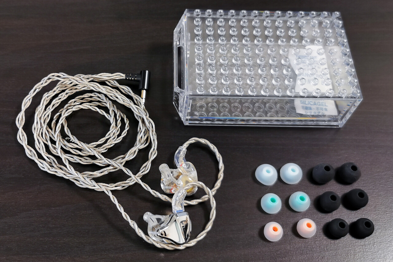 パッケージ内容はイヤホン本体、ケーブル、イヤーピースはシリコンタイプ2種類(それぞれS/M/Lサイズ)、ハードケース、説明書など。Jade Audio系らしくFD/FH系より付属品はシンプルです。レゴブロック状の新しいプラスチックケースは複数持ってると棚みたいに使えてちょっとうれしいです(^^)。