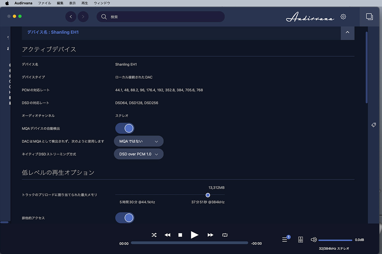 「SHANLING EH1」の仕様としては、「CS43198」DAC &「SGM8262-2」アンプ×2と、ポータブルDAC/アンプだと「Shanling H2」あたりに相当するグレードですが、据置きモデルと言うことで内部回路は余裕を持った設計となっており、スペック的にも32bit/768kHz、DSD512と「Shanling H2」よりアップグレードされた仕様になっています(Macで接続の場合DSDはDoP接続となるためDSD256までの表示となります)。