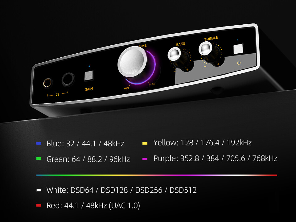 ボリュームノブ周辺部分はサンプリングインジケーターとなっており、再生中のサンプリングレートや、EH1のステータスに連動しライトアップするカラーが変化します。