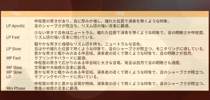 なお、「NiPO N2」の特徴のひとつとして、搭載される「ULA」アーキテクチャに最適化された7種類のフィルターが選択できる点があります。多くの場合、通常の「LP Apodiz」のままで快適ですし、これらのフィルターはそこまで大きな変化が発生するわけではありませんが、音源の質感に併せて組み合わせることで、より豊かなサウンドを楽しむことができます。
