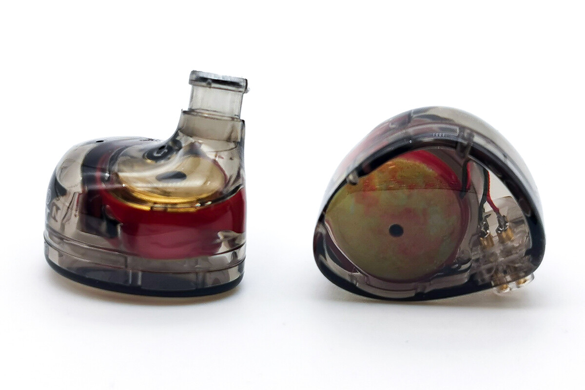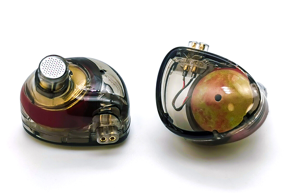 本体は透明なプラスチック製。「ブラック」カラーの場合はクリアブラックのシェルで、「トランスペアレント(透明)」は透明なシェルを採用しています。本体内部で大半を占める12mmダイナミックドライバーはメタルシャーシに収容され、背面部に惑星をイメージしたデザインのドーム状のカバーが覆っています。