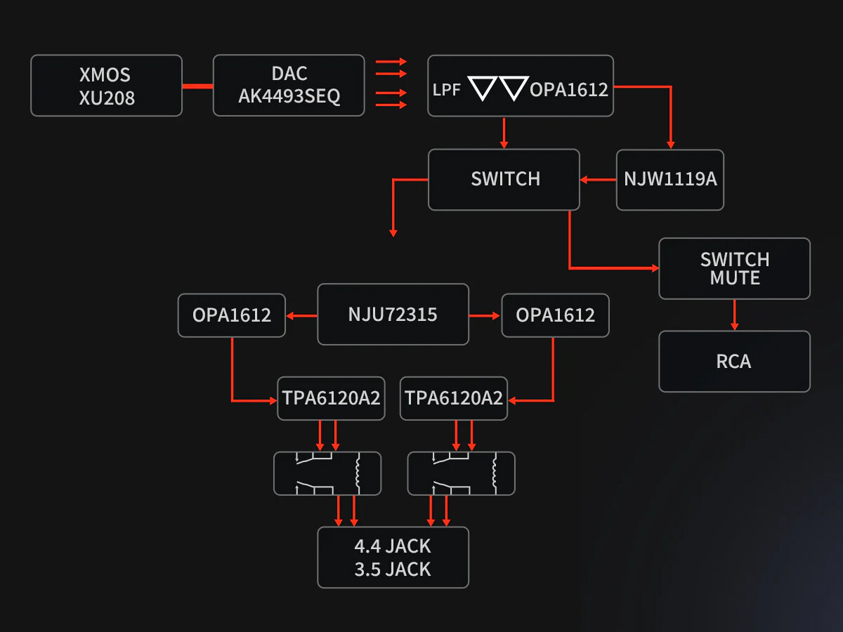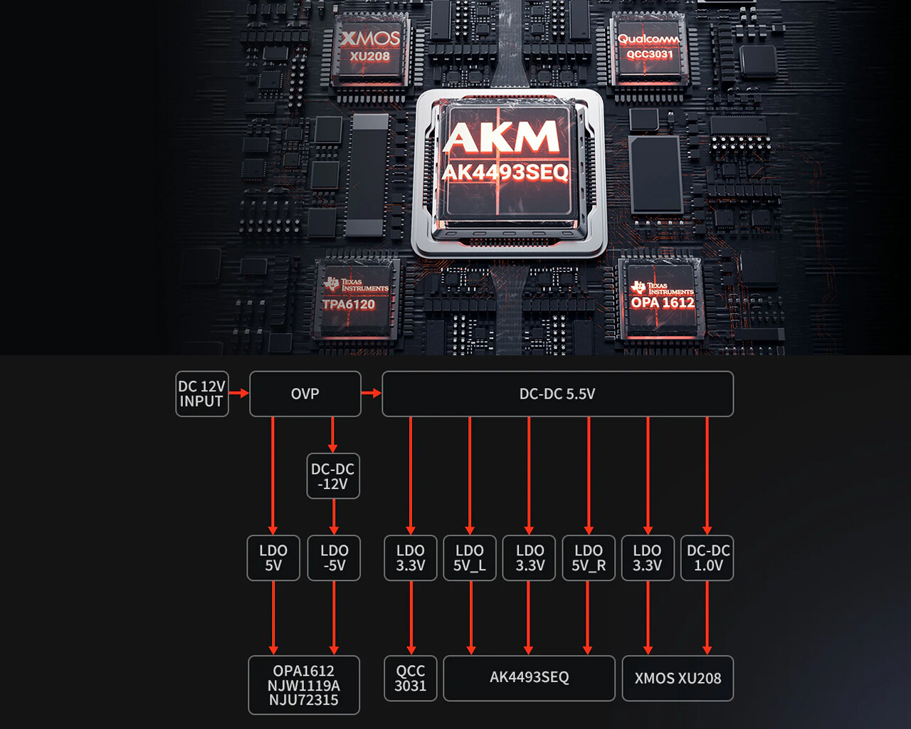 「Fosi Audio K7」はDACに「AKM4493SWQ」、LPFおよびオペアンプに「OPA1612」ヘッドホンアンプに「TPA6120A2」、USBインターフェースに「XMOS XU208」などのチップを採用し、高解像度、広いダイナミックレンジ、超低ノイズ、低遅延、高出力を実現。また各段に低ノイズLDO(低ドロップアウトレギュレーター)を採用し、クリーンな電源出力確保し、音響性能および駆動力を向上します。