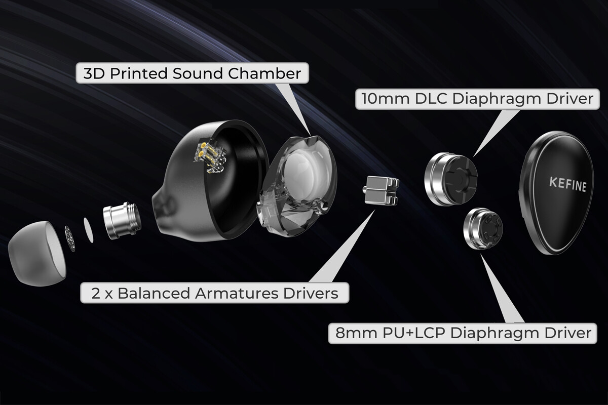 「KEFINE Quatio」は2DD+2BA構成によるクアッドドライバー仕様で、10mm、8mm、デュアルBAによる3Wayクロスオーバー設計を採用。ベースとなる10mm DLC振動板ダイナミックドライバーは、全周波数帯域にわたって高解像度のレスポンスを実現。そこへ8mmPU+LCP振動板ダイナミックドライバーにより低音域のレスポンスを強化。さらにデュアル構成のバランスド・アーマチュア(BA)ドライバーは、5kHzを超える高周波数帯域を強化します。これら4つのドライバーと物理的な音響チューブと電子クロスオーバーボードの両方を組み合わせたハイブリッドクロスオーバー設計を組み合わせることで高品質のサウンド再生を実現します。