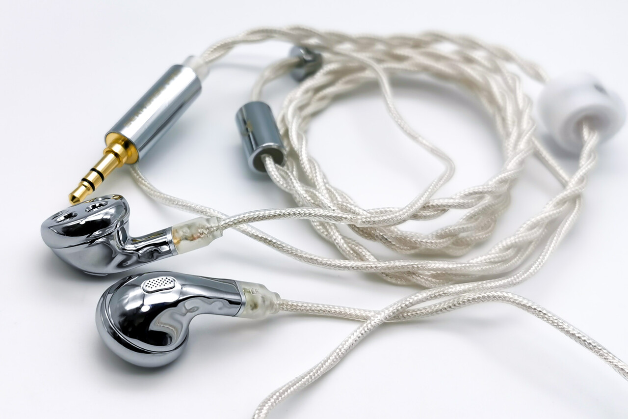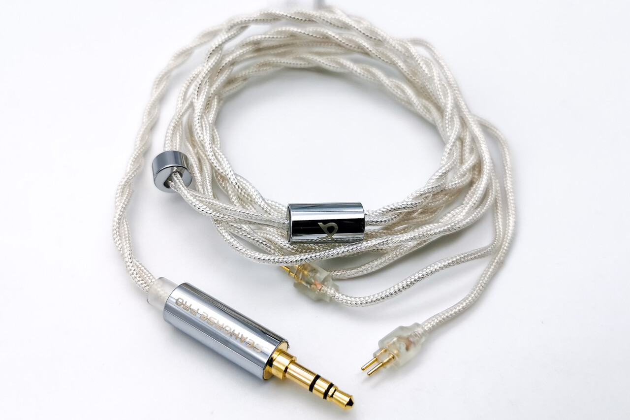 ケーブルは編み込まれた繊維被膜の銀メッキ線による2芯タイプ。適度な太さがありますが撚り線タイプのため取り回しはまずまず良好です。コネクタは2pinタイプでTRNのカナル型同様にqdcタイプと互換性のあるカバー形状ですが、極性を間違えないように片方に突起がある仕様になっています。もしリケーブルする際には極性に注意した方が良さそうです。