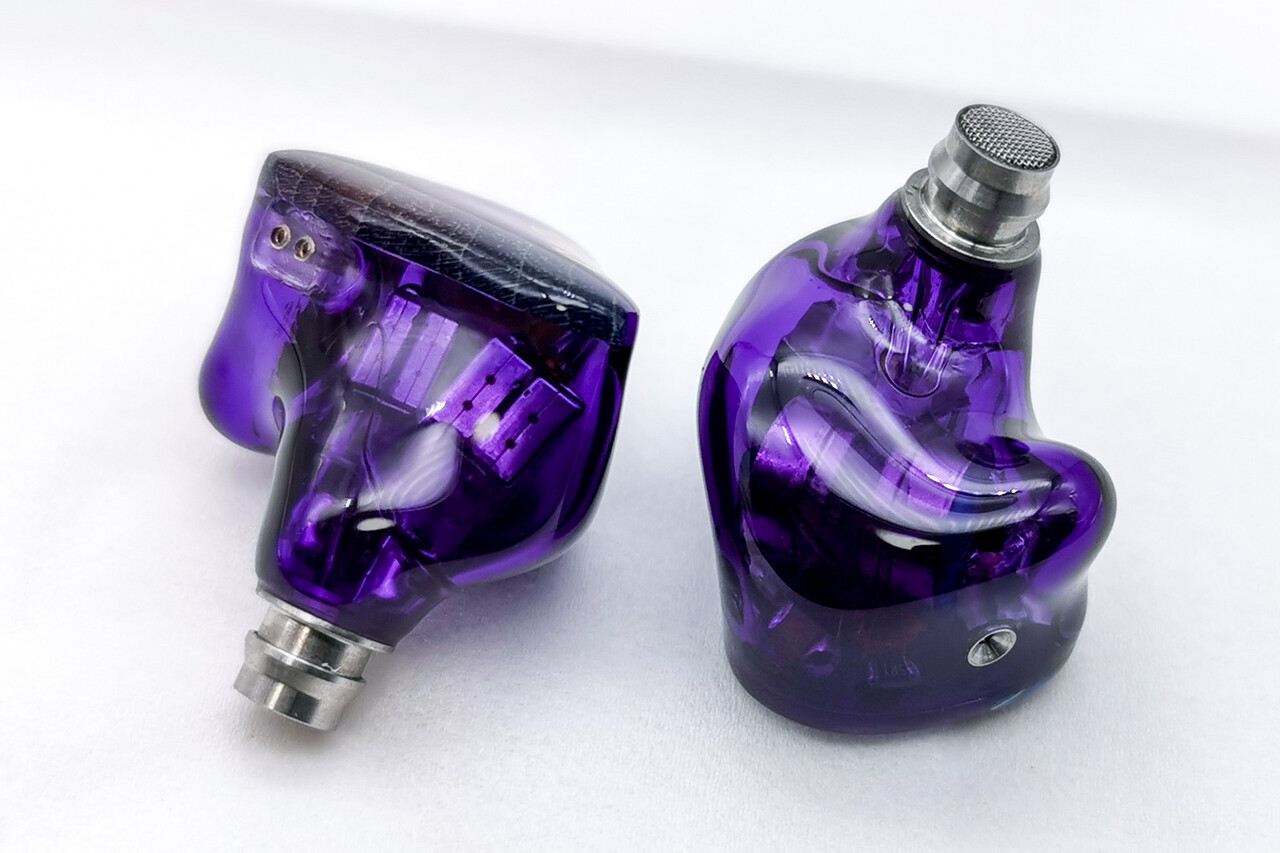 金属製のステムノズルは少し太めですが、シェルサイズは8BA+2DD構成としては結構コンパクトにまとまっており、装着感も良好です。シェルから内部のドライバー構成をある程度確認ができますが、ステムノズル直下に4基のミッドBAと4基のツィーターBAがダンパーを配した音導管に接続されているのが確認でき、ダイナミックドライバーは8mmサイズのユニットが2基向かい合った対向配置となっているのがわかります。そして側面には金属パーツで補強されたベント(空気孔)が配置されています。