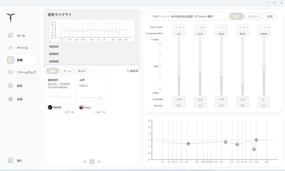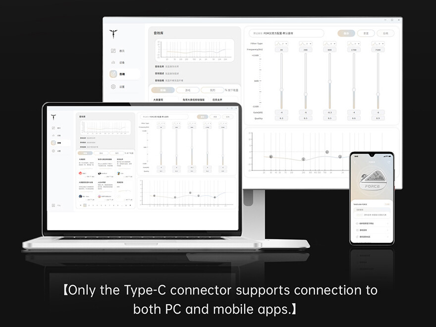 このDSP内蔵USB Type-Cプラグを使用する場合、「TANCHJIM」の公式アプリによる詳細設定に対応します(掲載時Android版アプリおよびWindows版が「TANCHJIM FORCE」に対応)。5バンドEQによる微調整や、ハーマンターゲットカーブ(2013/2016/2019)を含む厳選プリセットからの選択も可能です。またゲーム用やカスタム、コミュニティによるプロファイルも利用可能です。