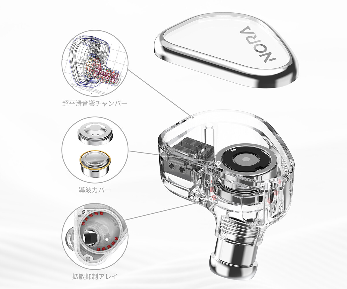 ドライバーにはTANCHJIMのフラッグシップ技術「DMT5」構造を採用し、振動板にDLCドーム、PUサスペンションエッジによる複合振動板デュアル磁気回路デュアルキャビティダイナミックドライバーをシングルで搭載。DLCドーム部は高域の伸びを最適化し、素早くクリアな過渡応答を可能とし、PU素材によるサスペンションエッジは素材特有のダンピング性能により不要な振動を吸収して低域に弾力感を持たせ高域の共振ピークを抑制。透明感と繊細さを備えた自然な音を実現します。またドライバーを収容するシャーシでは上位モデル同様の導波カバーを備えエネルギー伝達効率と解像度を向上させます。