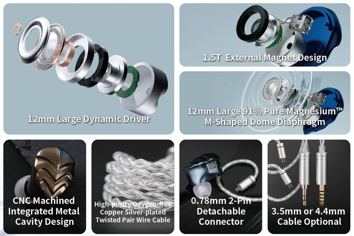 「HIDIZS MK12 Turris」は世界初の12mm大口径91%ピュアマグネシウム振動板ダイナミックドライバーを搭載したIEM製品。より迫力のある低音、よりクリアな高音、純粋な HiFi サウンドを、羽のように軽く、安定した快適な装着感で楽しめるイヤホンです。