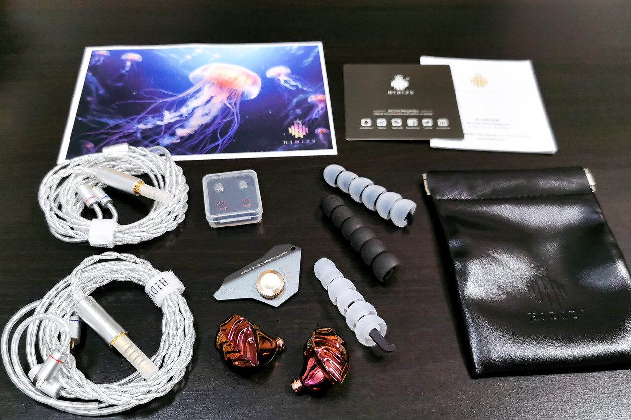 パッケージ内容はイヤホン本体、ケーブルが3.5mmタイプと4.4mmタイプの2種類、イヤーピース(3種類、それぞれS/M/Lサイズ)、サウンドフィルター(ケース入り)、レザーポーチ、説明書、保証カード、さらに限定シリアルナンバー入りのポストカードと特製バッジも同梱されます。