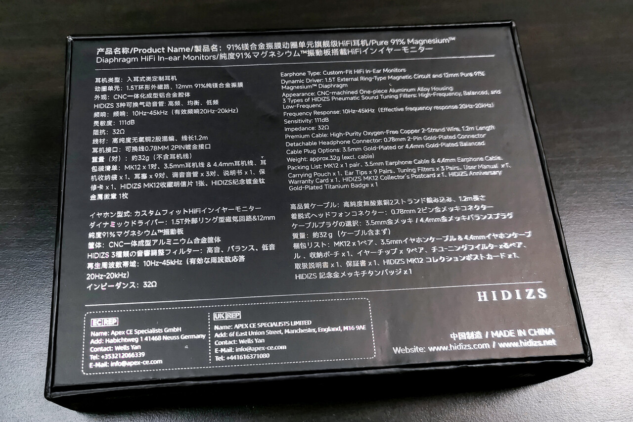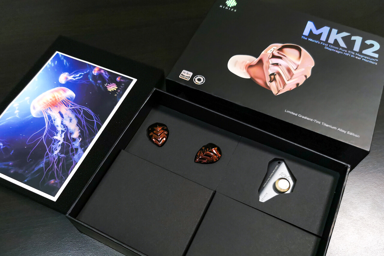 「HIDIZS MK12 Turris Gradient (Tint Titanium Alloy Edition)」は通常版より大きめの専用パッケージが用意されています。ブラックを基調としたデザインでより高級感のある印象です。