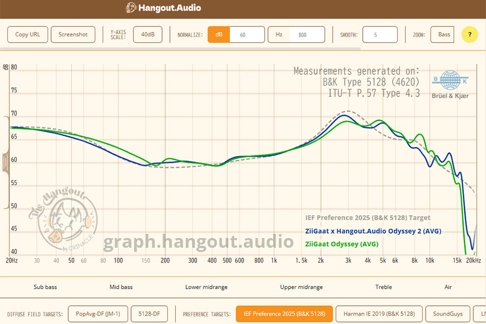 なお、前述の通り、「ZiiGaat x Hangout Audio: Odyssey 2」についてはCrinacle氏はサウンドチューニングそのものには参加していないそうですが、コラボしているHangout Audioが公開しているf値を見ると、同氏による「IEF Preference 2025」に極めて忠実にチューニングされていることが分かります。これがHangout Audioからの要望なのか、ZiiGaatによる歩み寄りなのかは不明ですが、オリジナルの「Odyssey」がそもそも結構近いバランスで、今回のベースとなったことも納得がいく内容になっています。