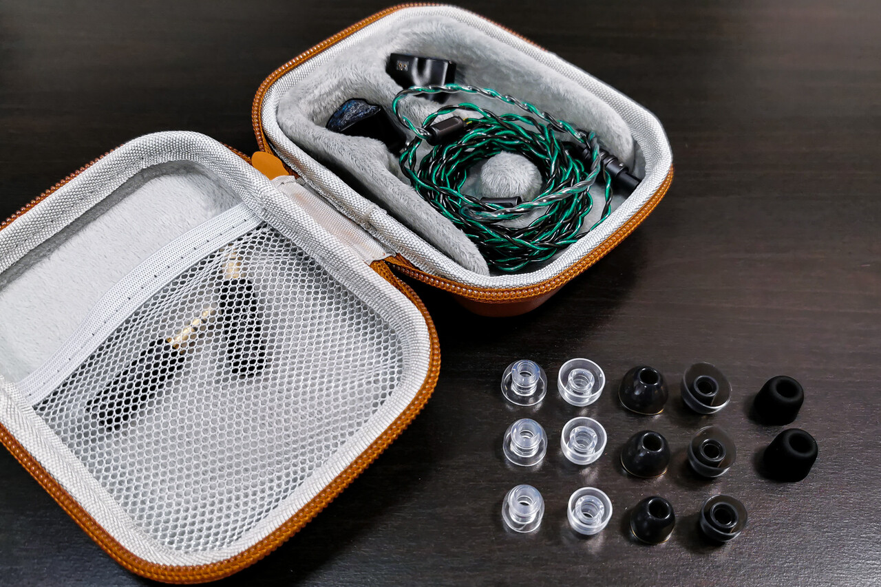 パッケージ内容は、イヤホン本体、ケーブル、交換用プラグ、イヤーピース(黒と透明の2種類の液体シリコンタイプがそれぞれS/M/Lサイズ、ウレタンタイプが1ペア)、大型のケース、説明書、保証書。