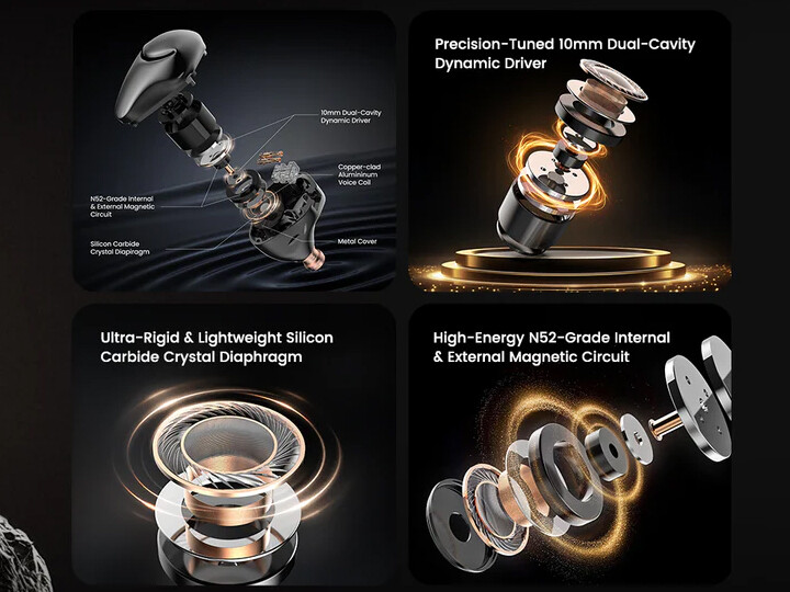 「HIDIZS MK10 ArcSonics」が搭載するドライバーは、高品質N52マグネットを採用し、精密に調整されたデュアル磁気回路とデュアルキャビティ構造を採用。磁束密度を高め、振動板の動きをより正確に制御し、エアフローを最適化し、不要な共鳴を低減することで、深みのあるクリアでパワフルなサウンドを実現しています。