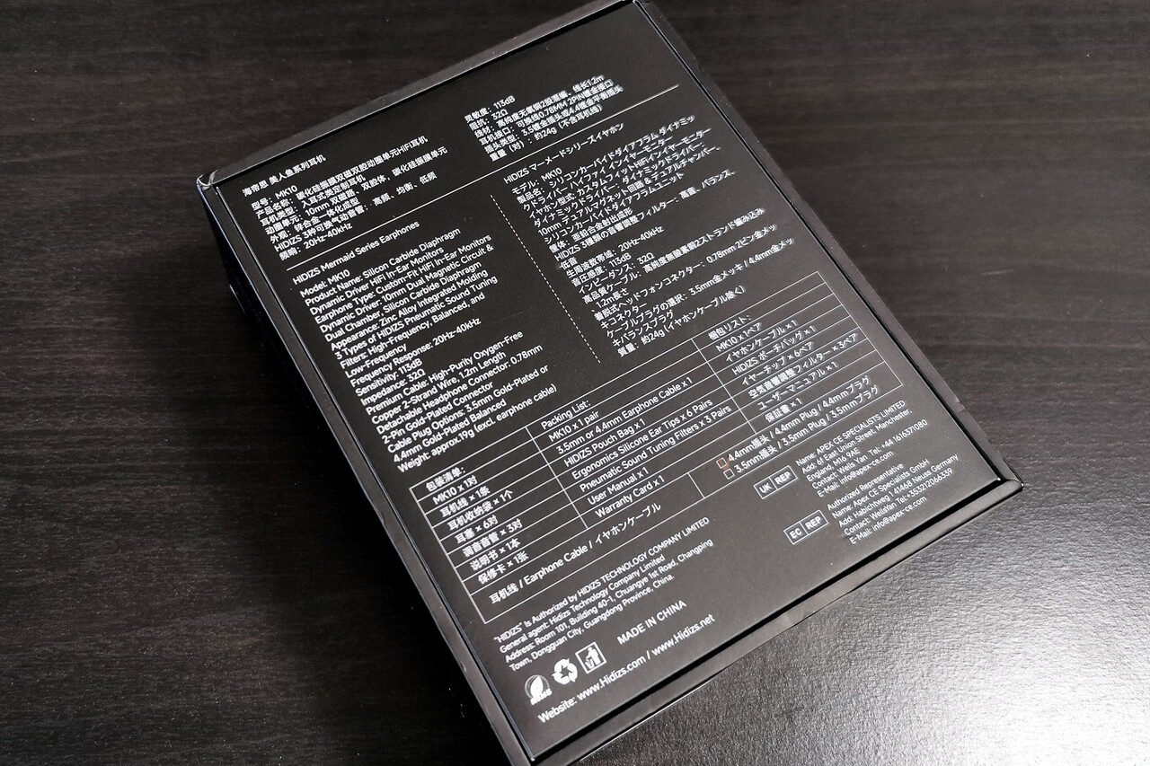 「HIDIZS MK10 ArcSonics」のパッケージは製品画像を掲載した黒箱デザイン。最近だと「MS2 PRO」などと同様のパッケージサイズですね。