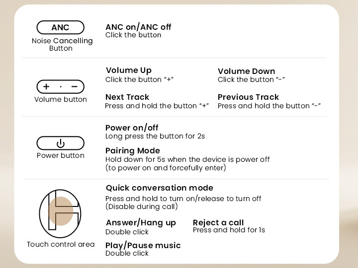 このタッチセンサーが再生/停止や受話/終話が割り当てられており、+/-ボタンは1回押しで音量調整、長押しで曲送り/戻しとなります。「ANC」ボタンはノイズキャンセリングのON/OFFと切替えられます。