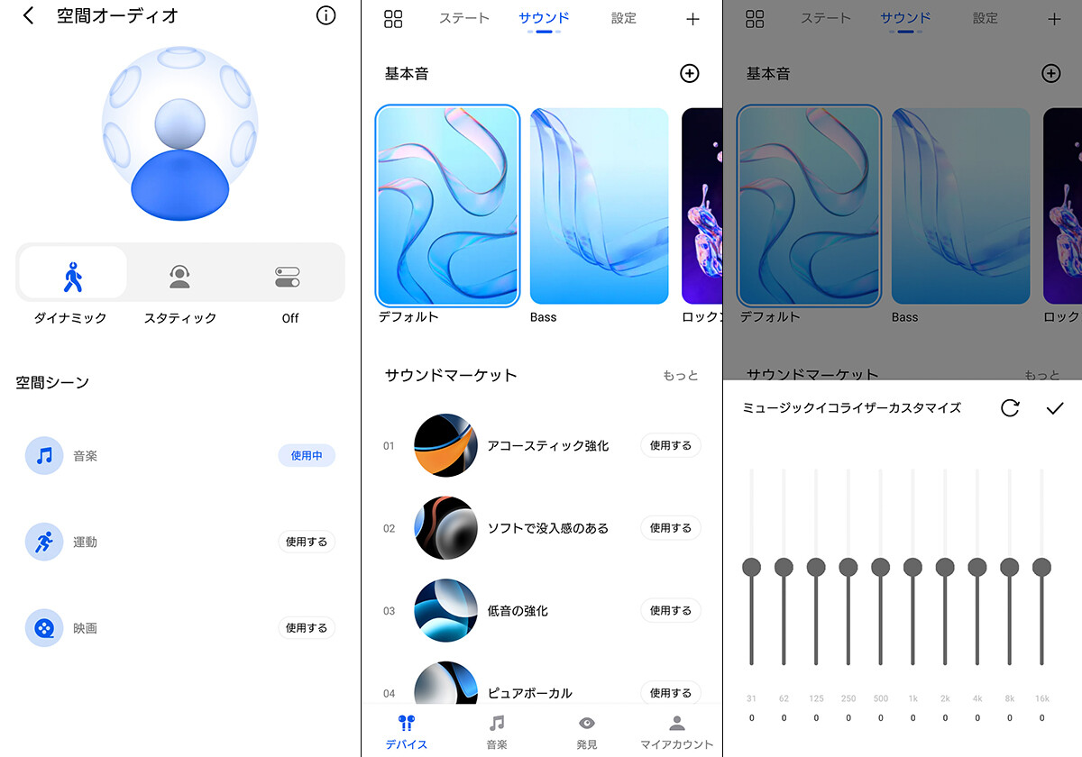「LDAC」を有効にするためにはいったんANCをOFFにしてからLDACのスイッチを入れます。本体が再接続され接続後は改めてANCを有効にすることが可能です。なお、「ゲームモード」「マルチポイント」「空間オーディオ」の各設定はLDAC未対応のため、スイッチをOFFにしてAAC/SBCでの接続にする必要があります。サウンドモードは複数のプリセット、設定済みユーザープロファイル、カスタム(EQ)設定が選べます。