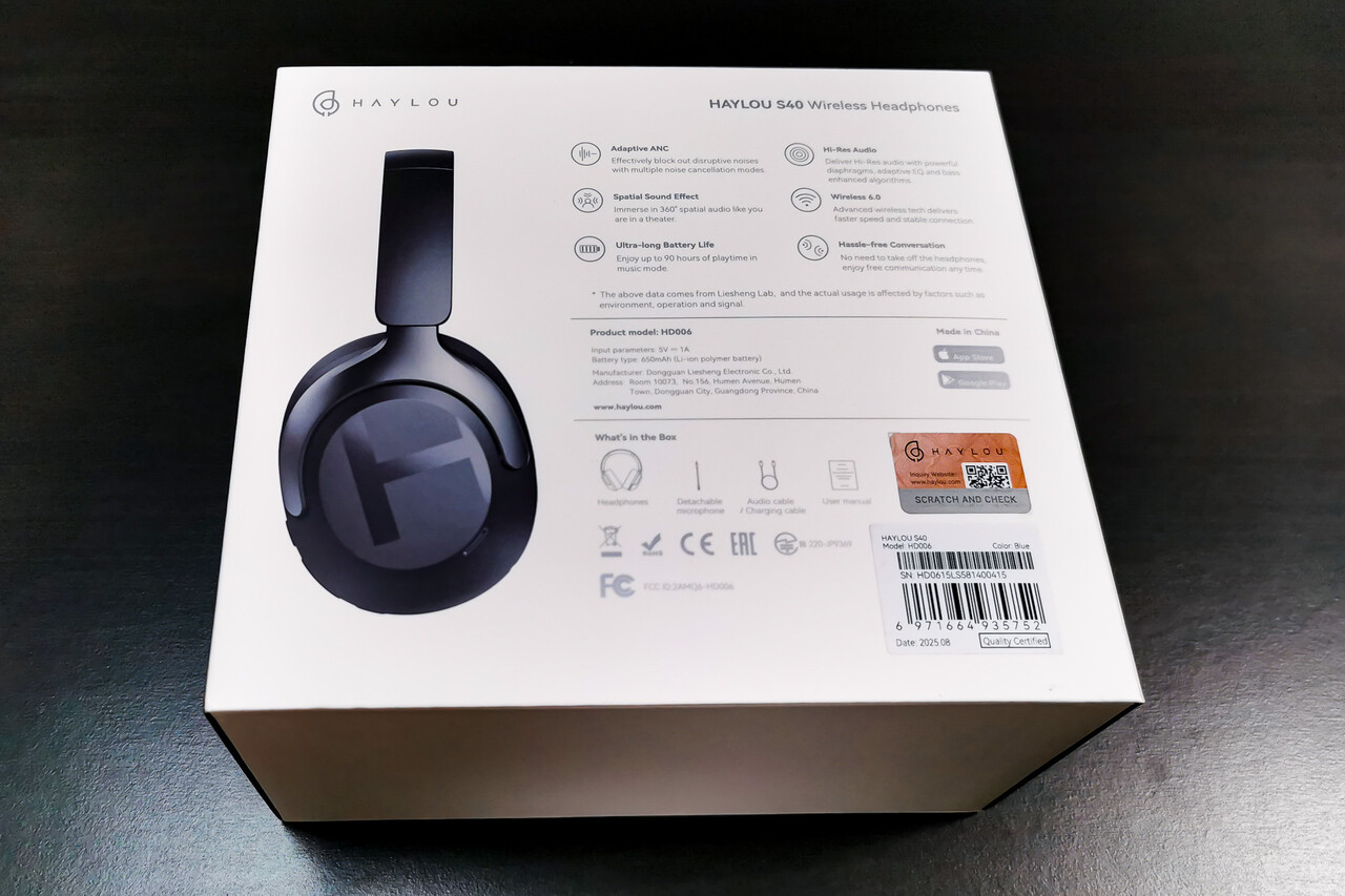 今回は「HAYLOU S40」の「ブラック」が届きました。パッケージは同社イヤホン製品同様に製品画像を乗せたシンプルなパッケージデザイン。裏面には製品仕様等が記載されています。