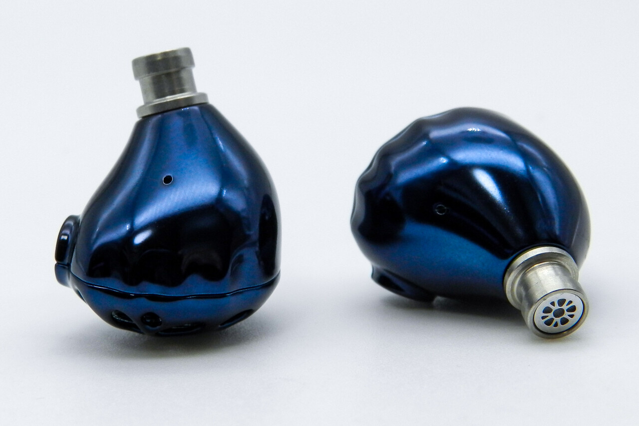 本体は鋳造による金属製で特徴的なシェルデザインです。丸い空洞のある外部シェルとサファイアカラーのクリスタルが埋め込まれた内側シェルが高級感があります。金属シェルのため多少重量があるのですが、フェイス部分はコンパクトなサイズ感にまとまっており、耳への収まりは良い印象。
