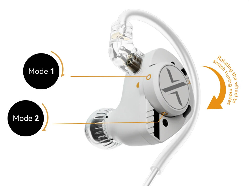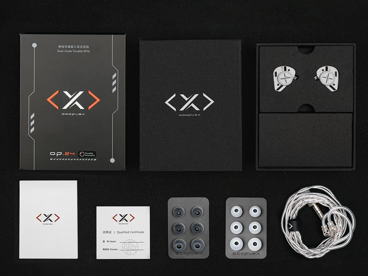 「ooopusX Op.24」は、新しいブランド「ooopusX」による2DD+4BA仕様のハイブリッドモデルです。製品名称のはこのドライバー仕様からだと思われますね。最大の特徴は新開発の「Tunable Acoustics Physical Tuning Dial」で、中央部分のダイアルスイッチでモードを変更することで2つのサウンドを自由に切り替えることが可能です。