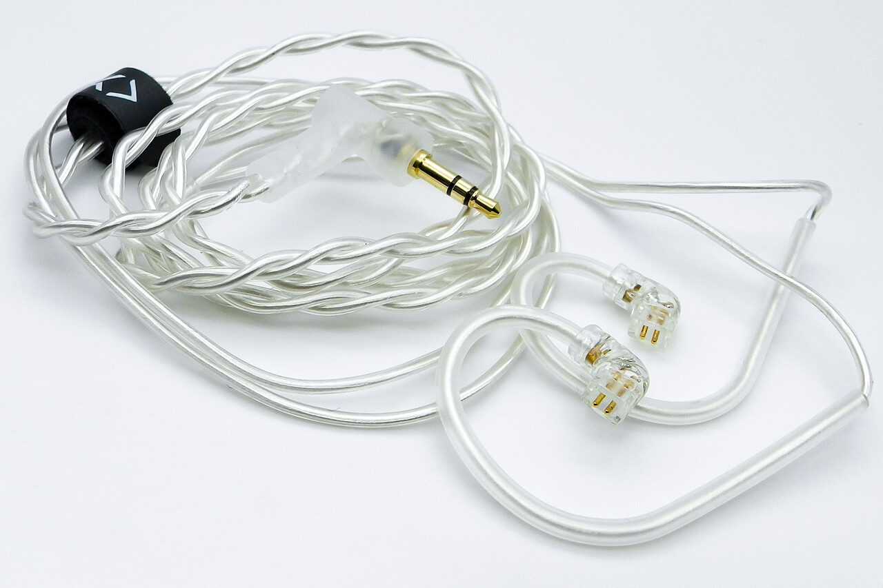 ケーブルはqdcタイプのカバー形状の0.78mm 2pin仕様。線材は銀メッキOFC線の2芯タイプです。やや細めでしなやかさがあります。またKZ/TRN用のqdcコネクタケーブルでリケーブルも可能です。ただ付属ケーブルは耳掛け加工部分の角度がいまひとつ私の耳に合わず、レビューでは類似したケーブルにリケーブルした場合も併せて比較しました。